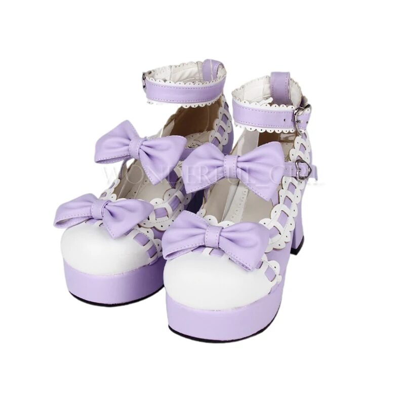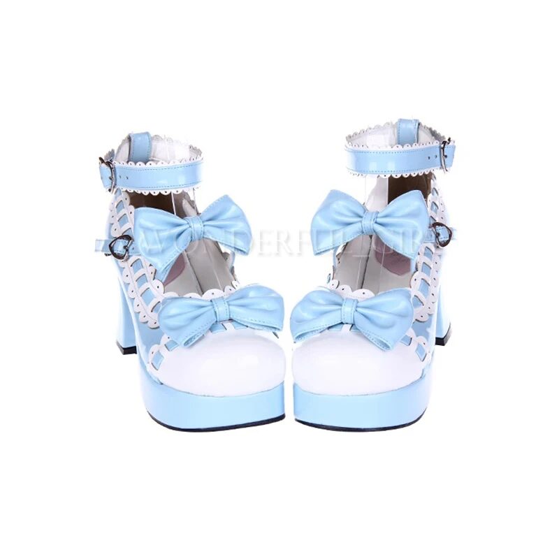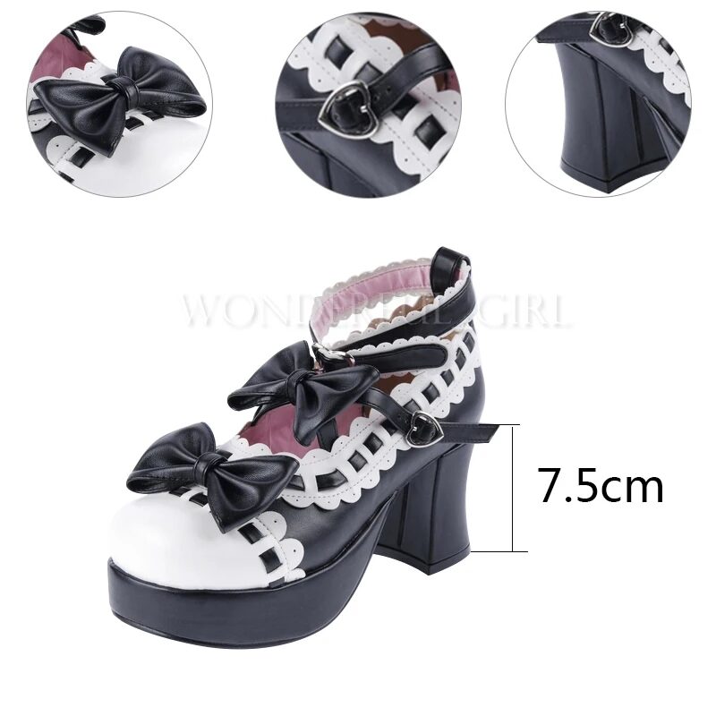 : Das Produkt sind hochhackige Damen-Schuhe im neuen japanischen Lolita-Stil, perfekt für Cosplay, Dienstmädchen oder Prinzessinnen-Kostüme. Die Schuhe sind mit einer hübschen Schleife verziert und in den Größen 35 bis 47 erhältlich. Ideal für alle, die einen verspielten und femininen Look lieben.