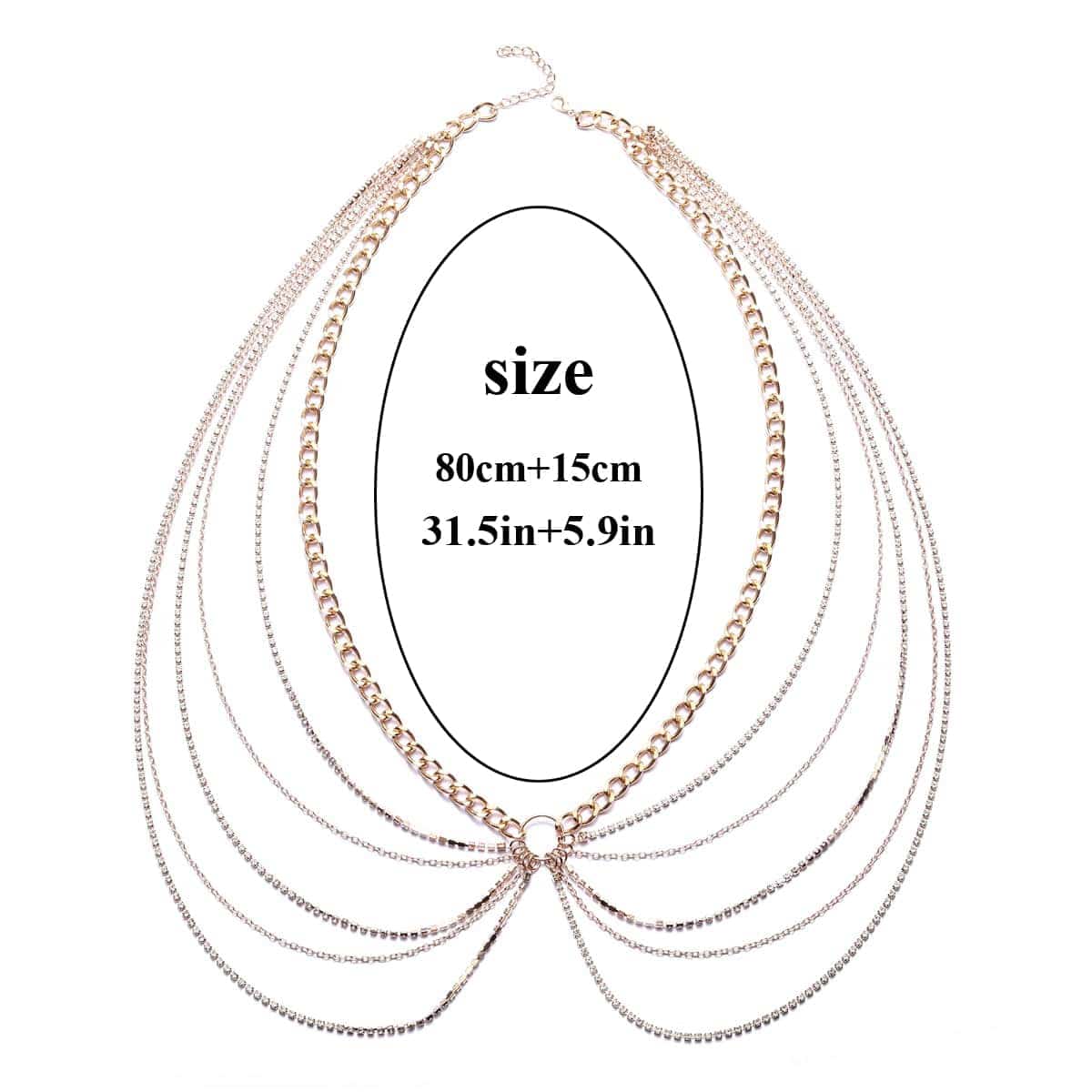 Unsere Körperkette besteht aus hochwertigem Metall und ist in einem coolen Design gestaltet, das dich zum Hingucker auf jeder Veranstaltung macht. Die Kette wird um den Hals und den Bauch getragen und verleiht deinem Outfit das gewisse Etwas. Du kannst sie über deinem Top oder deinem Hemd tragen oder sie direkt auf der Haut, um deinen Look noch gewagter zu gestalten.